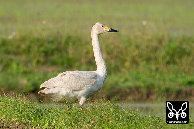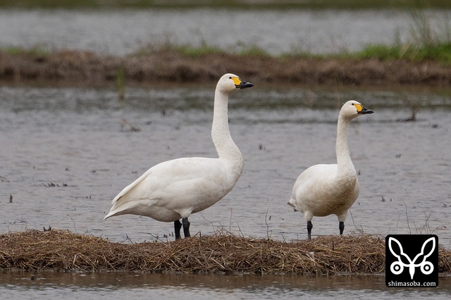 コハクチョウ2羽。西表島から移動してきた個体です。ダム湖や海岸、田んぼを転々としています。