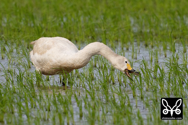 植えられたばかりの苗を食うコハクチョウ。心優しい農家でよかったです。