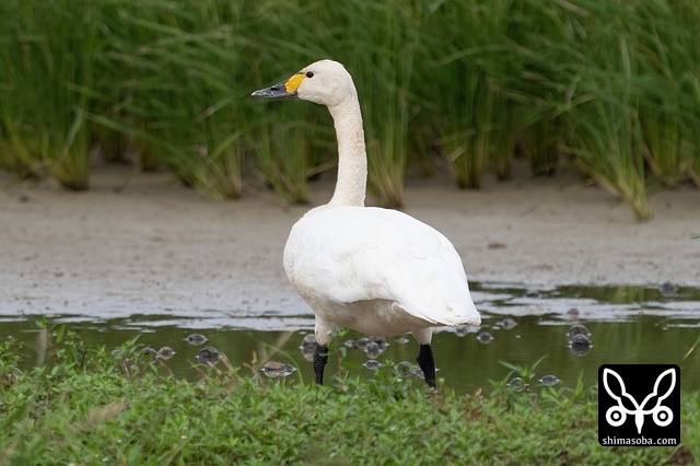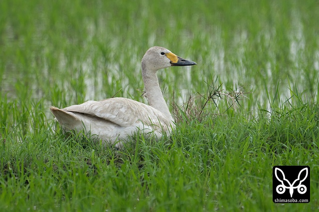 コハクチョウはイグサの田んぼに浮かびながら雑草を食っていました。背中にはテントウムシが乗っています。