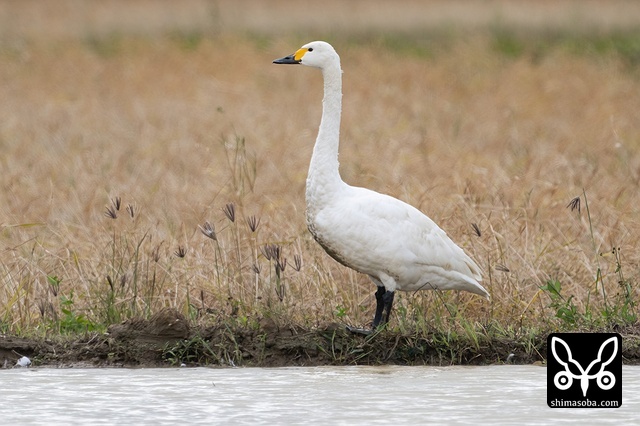長期滞在のコハクチョウ。今季は刈り取られない水稲が多いので餌には困らないようです。