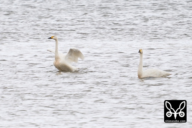 コハクチョウ2羽も長期滞在。右の個体は片足を痛めているようです。