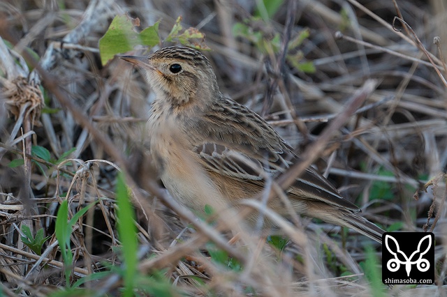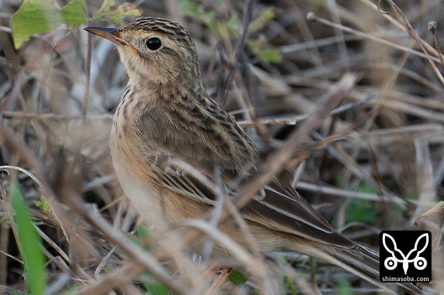 強風が吹き付ける中、畔の草むらに隠れていたコマミジロタヒバリ。