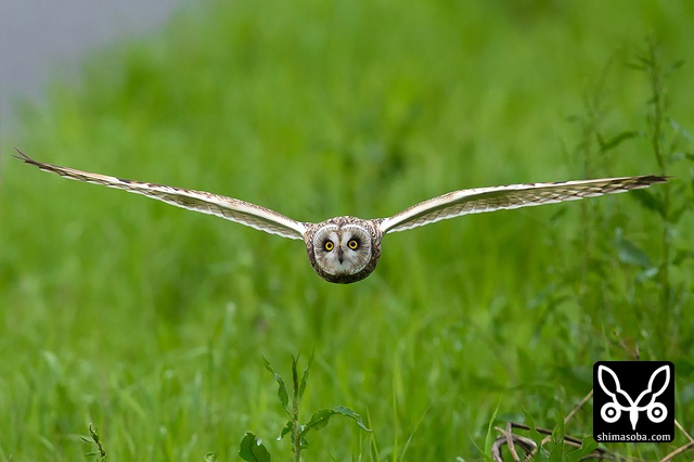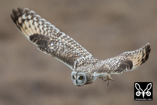 獲物を見つけて急降下するコミミズク。鋭い爪がはっきりと見えます。そして、やはりフクロウの仲間、翼が体に比べて随分と長いです。