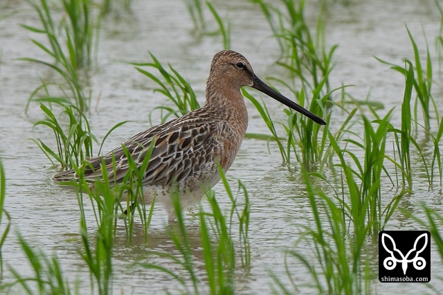 朝一で現地に到着したのですが、シベリアオオハシシギ狙いの車が20台ほど。狭い農道にずらっと車が並び農家の人の迷惑になりそうだったので、農道には入らずにロングショットで少しだけ撮影。おかげで畔の波トタンがしっかり映り込みました…。^^;