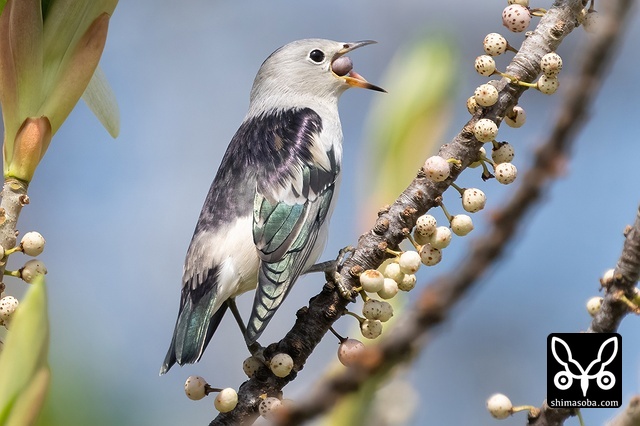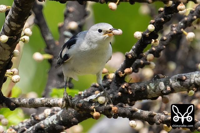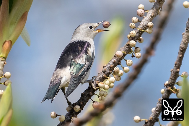 オオバアコウの実をくわえるシベリアムクドリ。