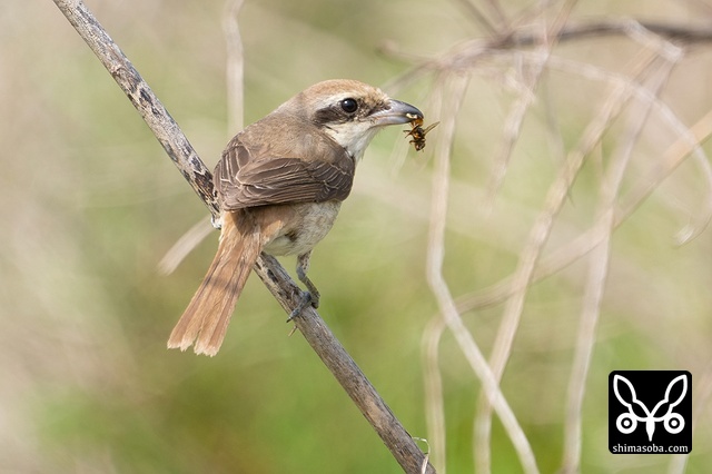 シマアカモズ第1回冬羽。ハチらしきを捕まえていました。