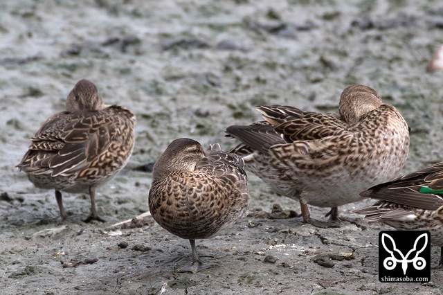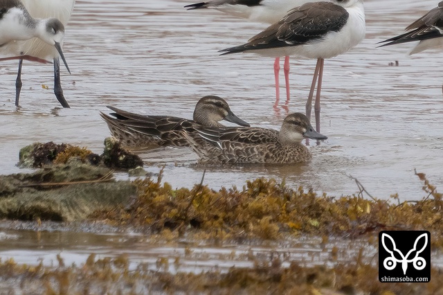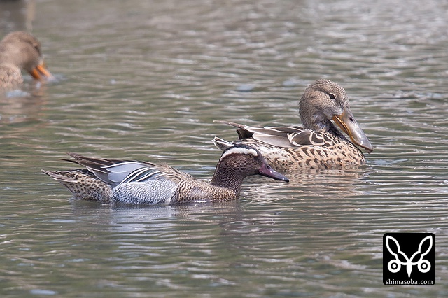 シマアジの2羽は、たくさんのコガモの群れの中でもお互い離れないよう近くにいた。