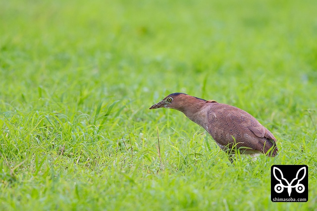 虹彩の色が違うだけど、ほかのズグロミゾゴイとはずいぶん雰囲気が違います。牧草地でミミズを捕まえていました。