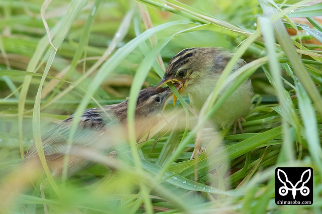 草むらの中で餌をもらうセッカのヒナ。