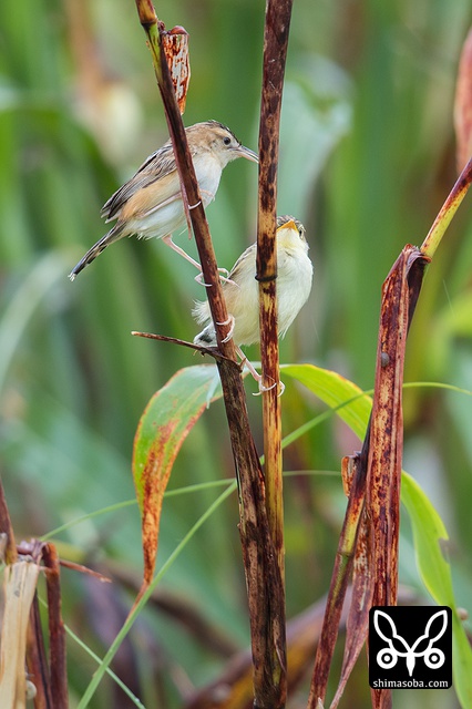 セッカの親鳥(上)とヒナ。こんな開けたところに止まるのはまれ。