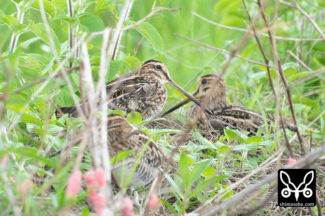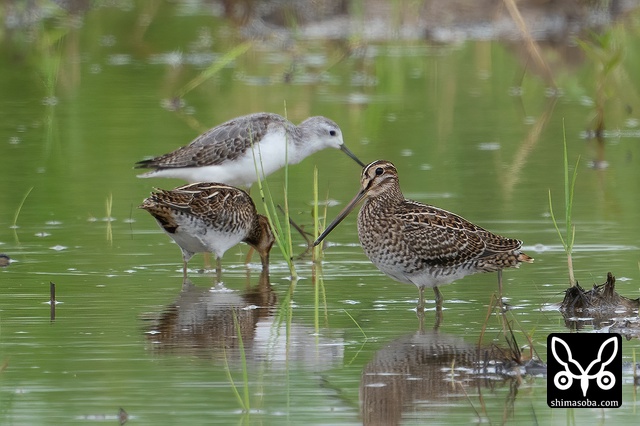 タシギ2羽とチュウジシギ(右)。