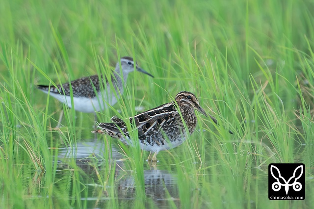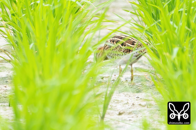 田んぼには数羽のタシギがいました。