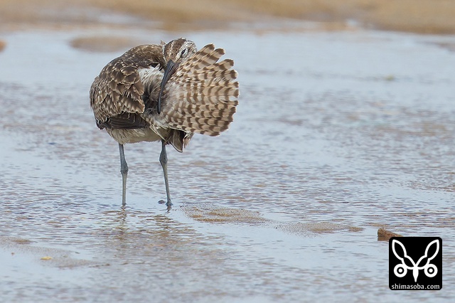 羽繕いするチュウシャクシギ。尾脂腺の脂を塗りたくっていました。台風に備えているのでしょうか。