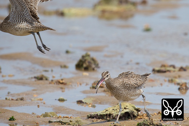 海岸にはチュウシャクシギが2羽やってきました。最干潮で鳥たちの距離は数百メートルありました。