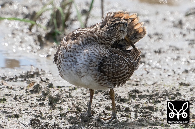 こちらもチュウジシギ成鳥。水浴び後の羽繕い中。