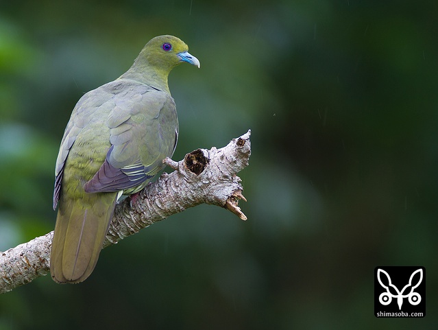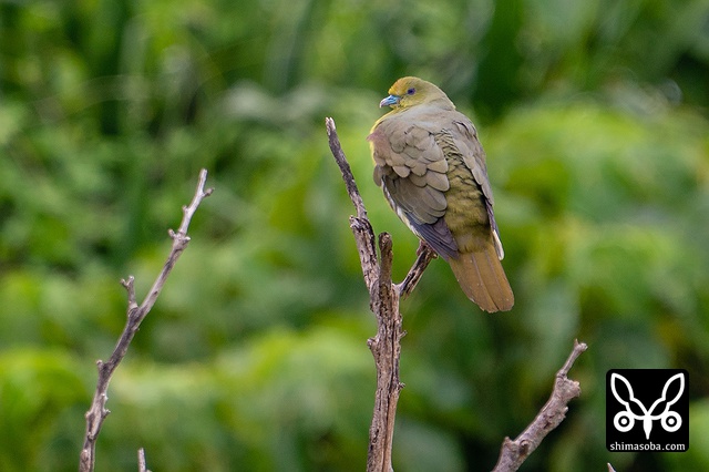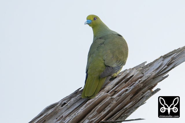 枯れ木に止まるチュウダイズアカアオバト。雨が降ると枯れ木や電線に多く現れます。