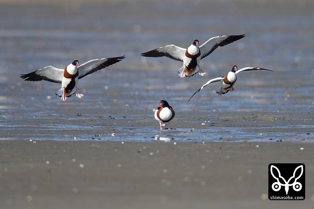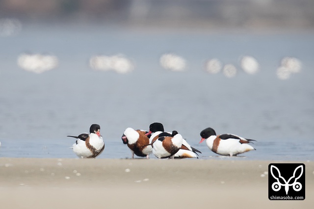 ツクシガモも大量にいた。干潟で休むツクシガモの後ろに見える白っぽい影も全てツクシガモ。