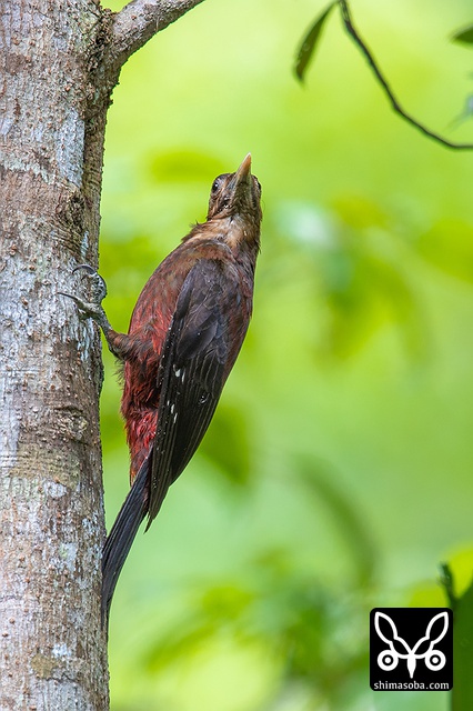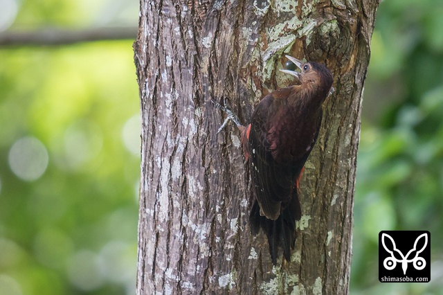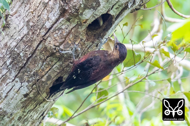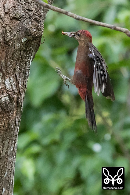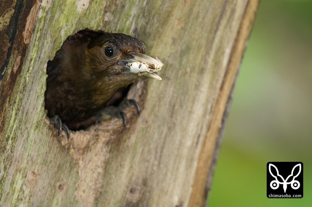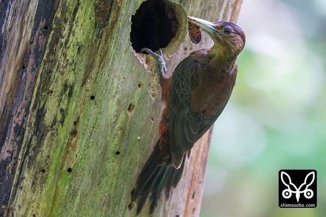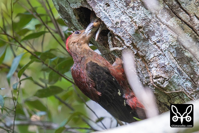 カミキリムシの幼虫を運んできたノグチゲラのメス。