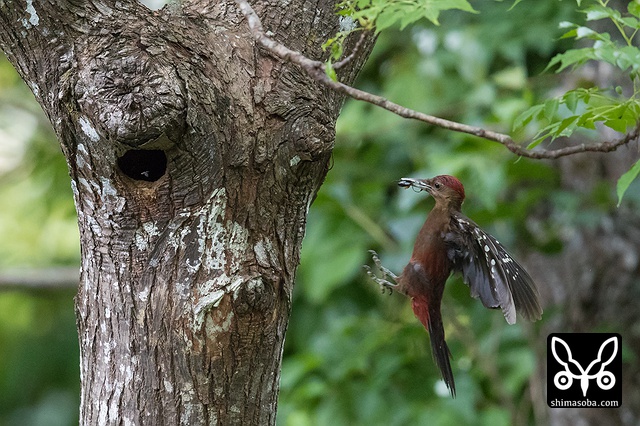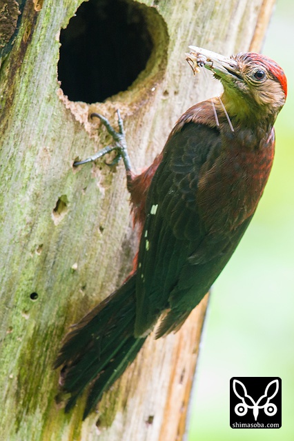 ゴキブリを2匹くわえて巣に戻るノグチゲラのオス。