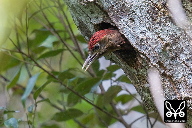 巣から顔を出すノグチゲラのヒナ。ヒナは、オスのように頭が赤い。