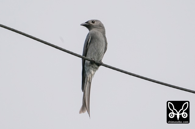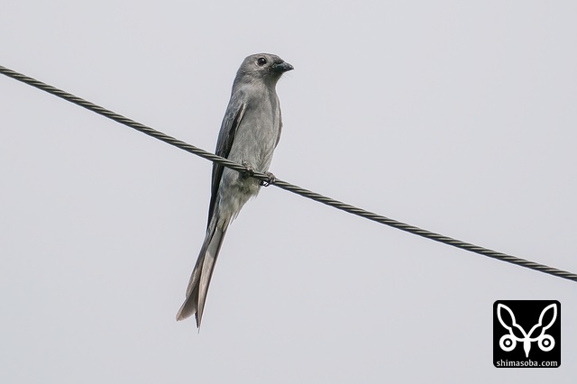 電線で朝日を浴びるハイイロオウチュウ。警戒心はさほどありません。