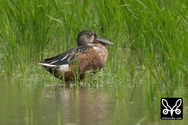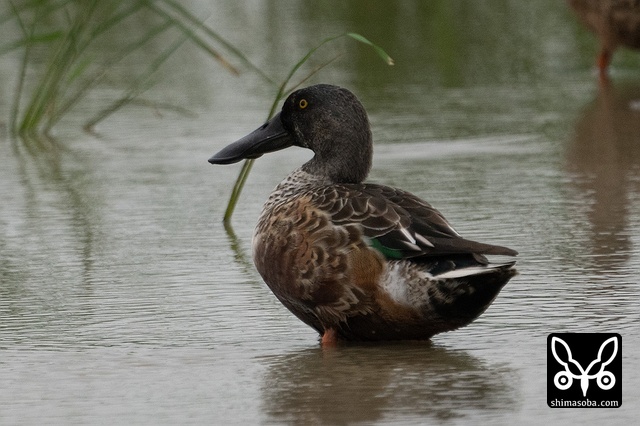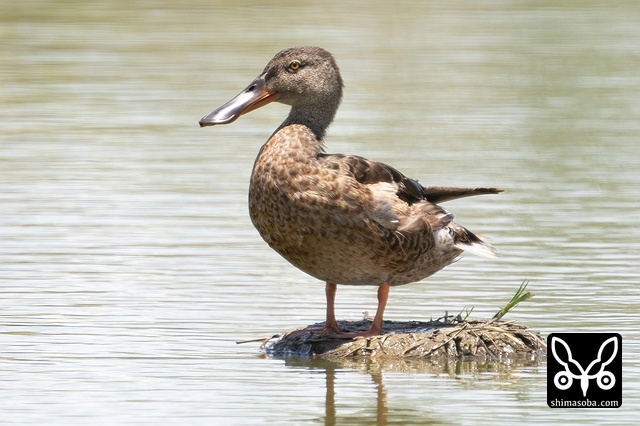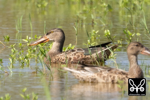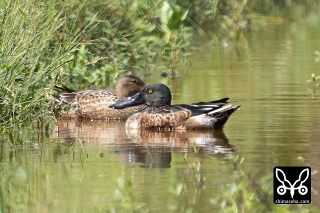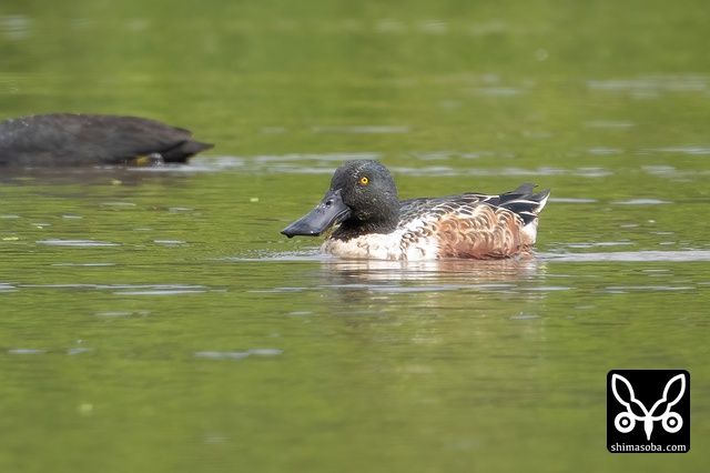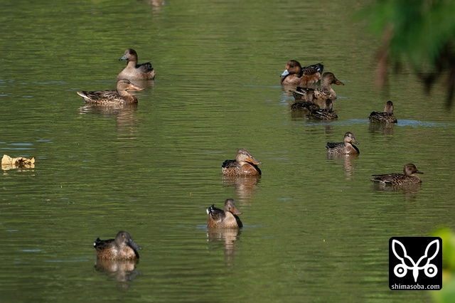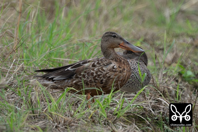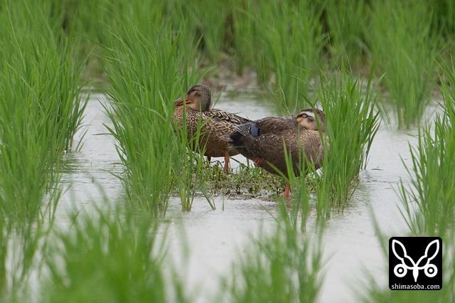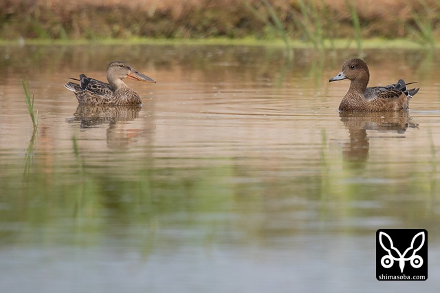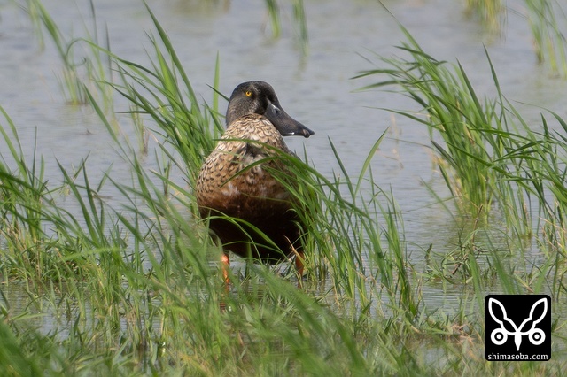 カルガモ以外、北上していなくなったのですが、田んぼにハシビロガモ(左)が1羽だけ残っていました。オスの幼鳥。石垣島で唯一、繁殖するカルガモは2週間ほど前から田んぼや水路で親子連れを観察できるようになりました。