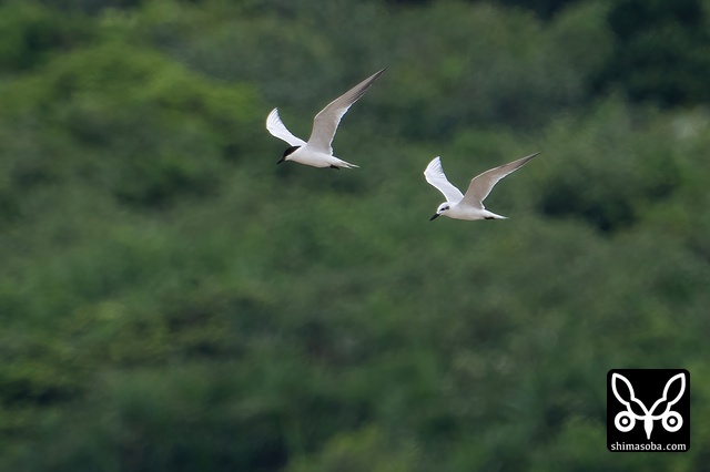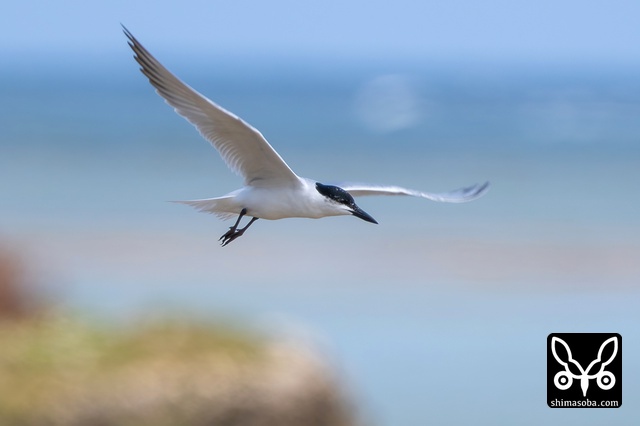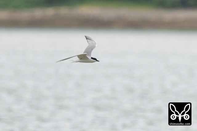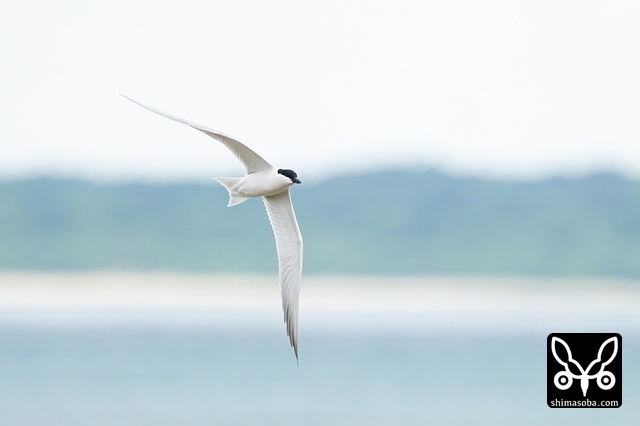 竹富島島をバックに河口を飛び回るハシブトアジサシ。