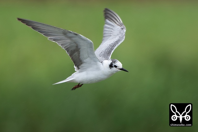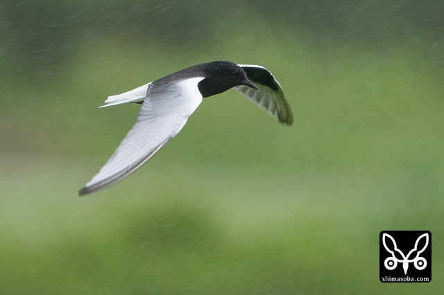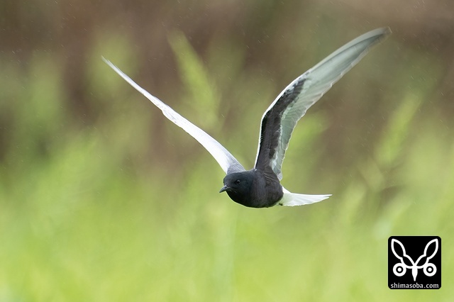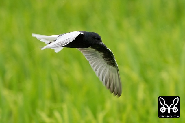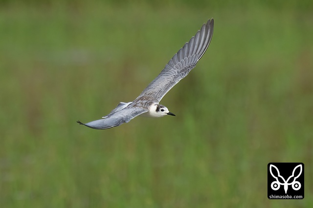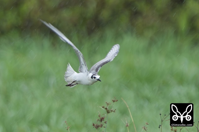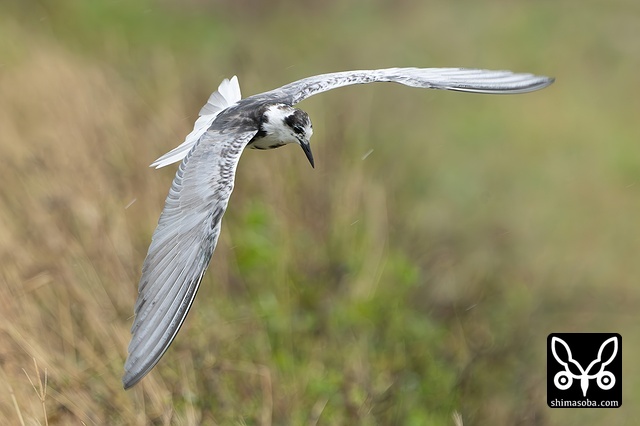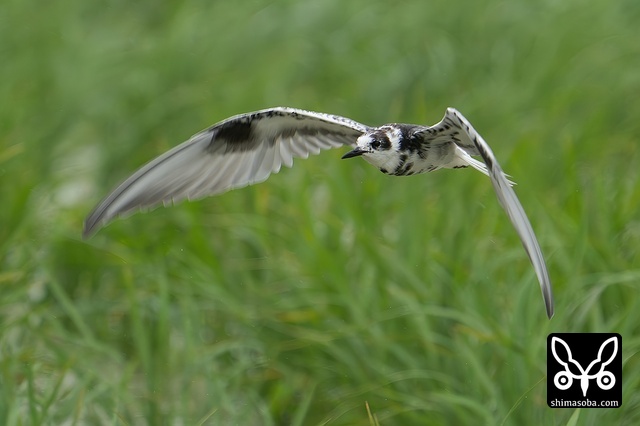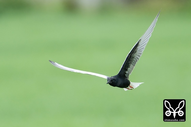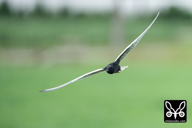 牧草地を飛び回るハジロクロハラアジサシ夏羽。