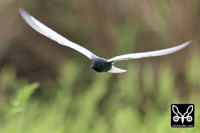 ハジロクロハラアジサシは台風の余波が残る強風の中、田んぼの上を飛び回りながらトンボを捕まえていました。