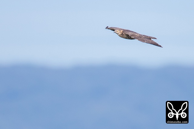 こちらは唐津湾をバックに悠々と渡っていくハチクマのオス。