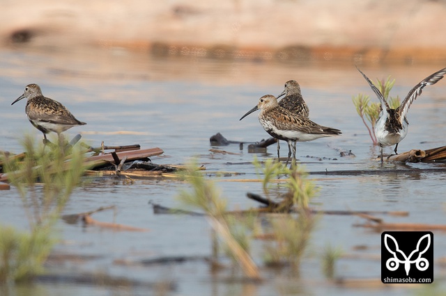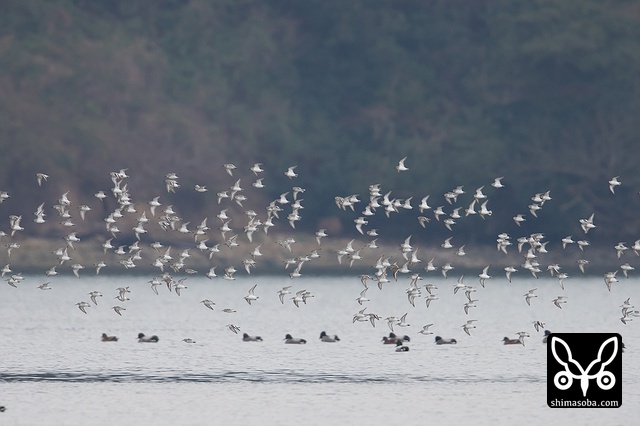 ミユビシギとハマシギは数百羽の群れが舞っていた。水面に浮かぶかもはヨシガモ。