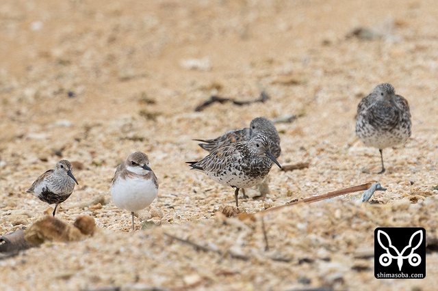 ムナグロ、キョウジョシギ、ハマシギ、メダイチドリ、シロチドリの群れ。
