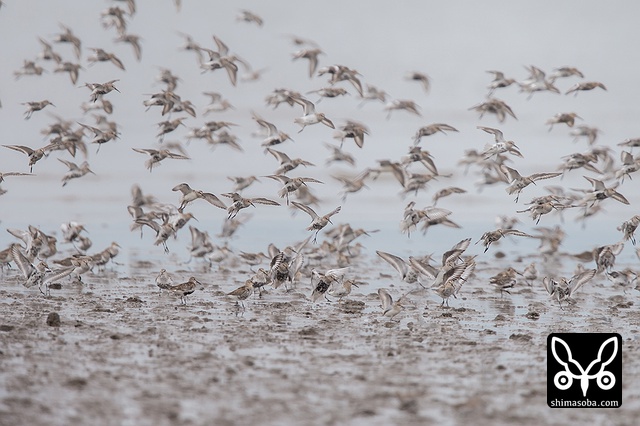 石垣島には小さな群れしかきませんが、東よか干潟には数千羽のハマシギが群れていました。