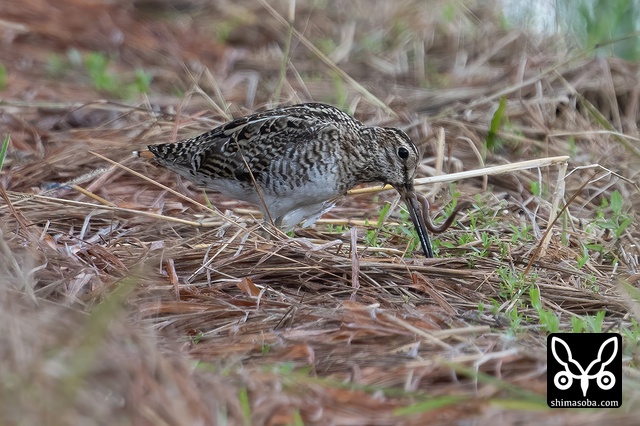 あぜでミミズと格闘するハリオシギ。