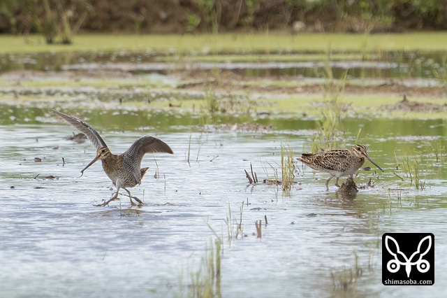 上と同個体のハリオシギ(右)とチュウジシギ。ダブルで尾羽を見せてくれました。2羽同時とは、とても貴重な場面ですねー。