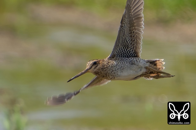 上と同個体。バイクに驚いて飛び上がったところ。針尾が見えます。横からだとチュウジシギの尾羽も細く見えるのですが、ハリオシギの針状の羽は長さが全然違いますね。
