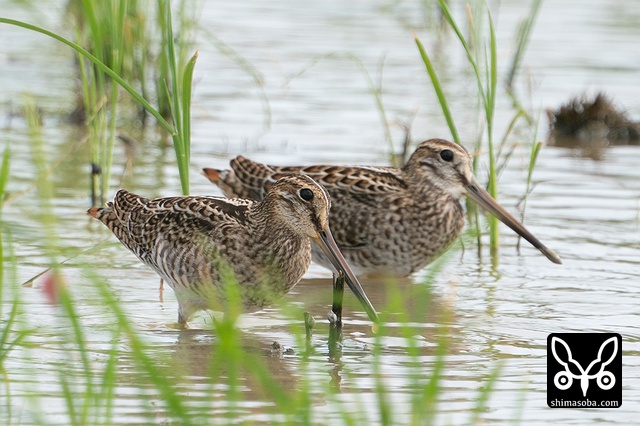 ハリオシギ成鳥(右)と幼鳥。右の大柄な個体が尾羽を見せてくれました。