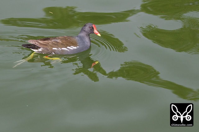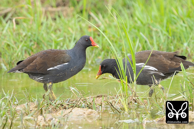 越冬オオバンと地元のバンは池で仲良く採餌。