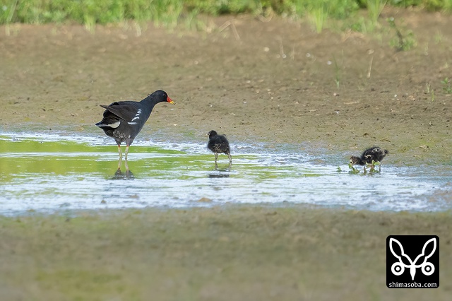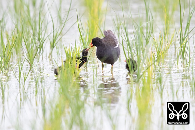 バンは4羽のヒナと両親の6羽が田んぼで散歩。