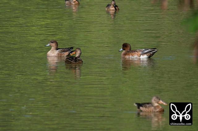 水路のカモたち。コガモ、ヒドリガモ、カルガモ、ハシビロガモです。
