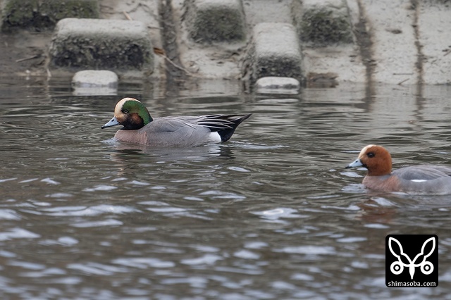 今季初のヒドリガモ。オスのエクリプス(左)とメスの非生殖羽。