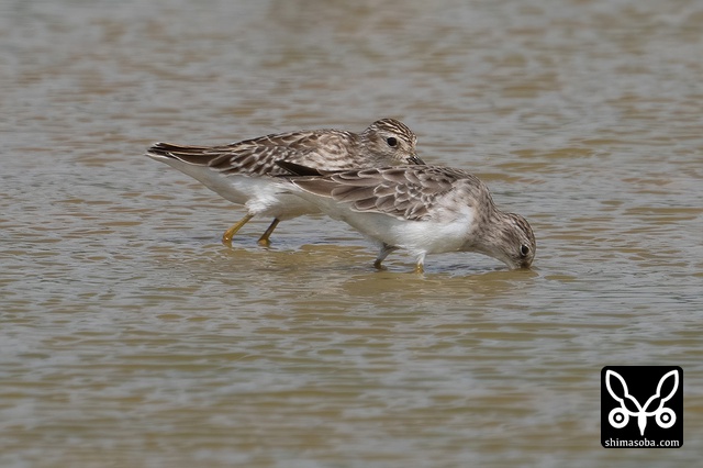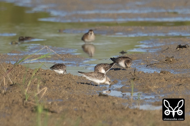 ヒバリシギは数羽の群れ。まだまだ増えます。早く夏羽が見たいですね。