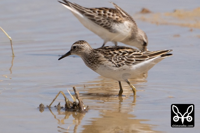 タシギ幼鳥(手前)とヒバリシギ幼鳥。