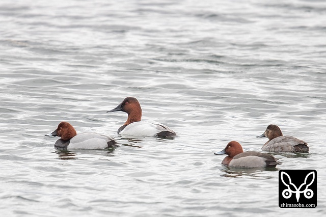 手前からメジロガモとホシハジロの雑種、オオホシハジロ、ホシハジロ。