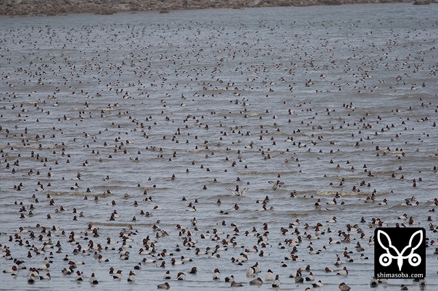 キンクロハジロ150羽の群れにホシハジロが10羽合流。