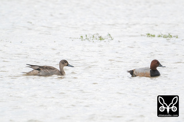 警戒心の強いカルガモ軍団が飛び立っても残っていたホシハジロ(右)とオナガガモ。