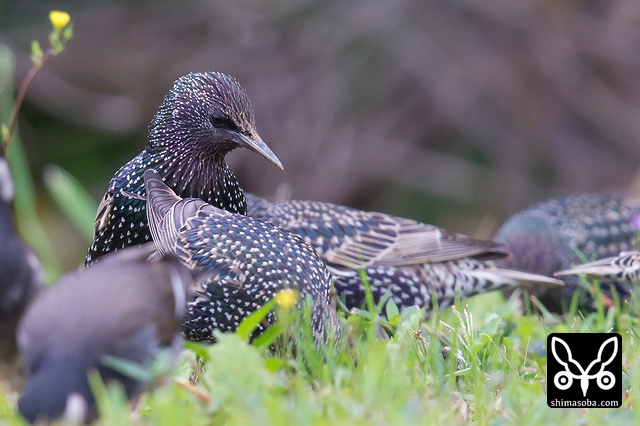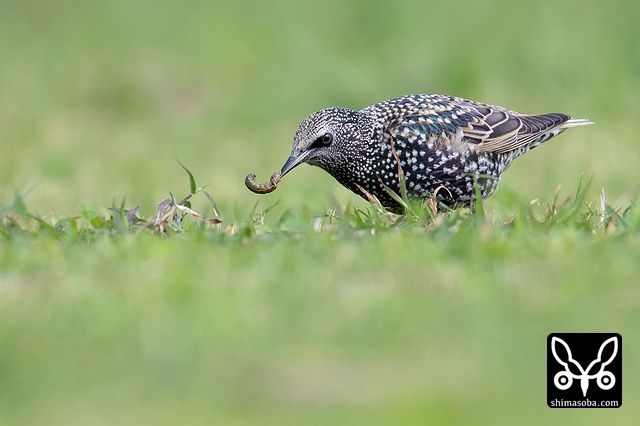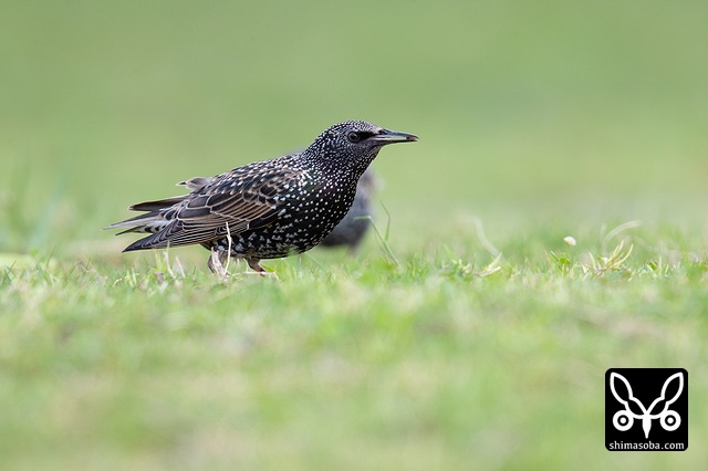 同じ群れいいたホシムクドリ。こちらはムクドリと採餌スタイルが似ているので、長いこと群れを形成しています。
