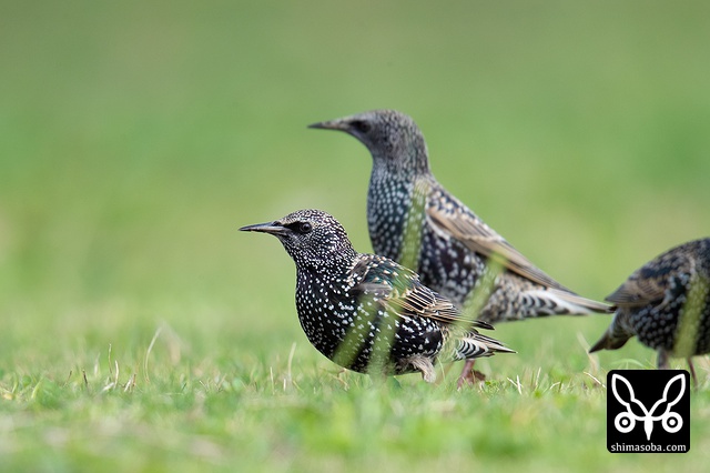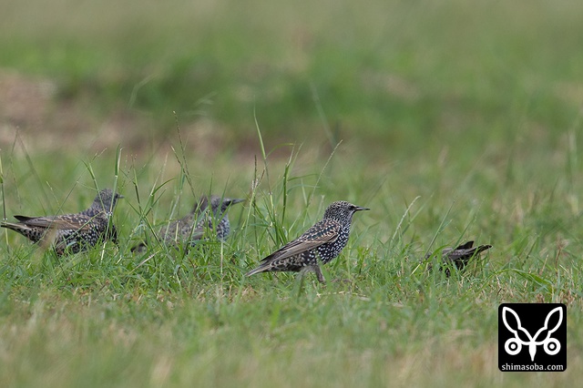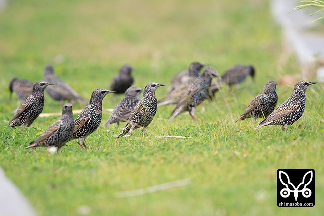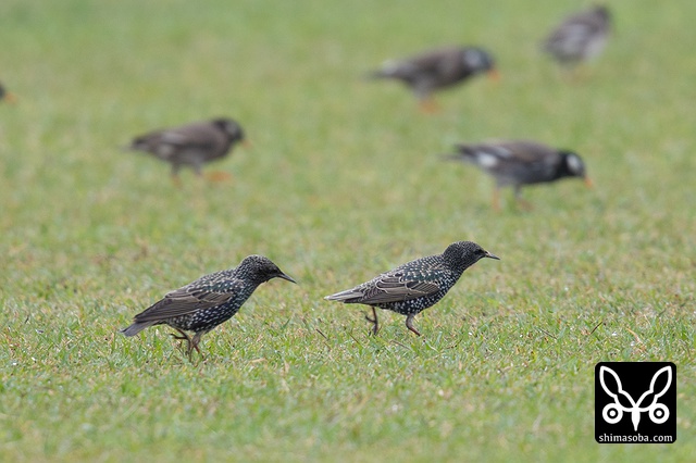 ホシムクドリとムクドリの群れ。牧場でエサ探し。