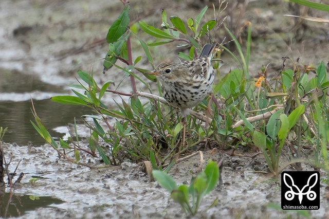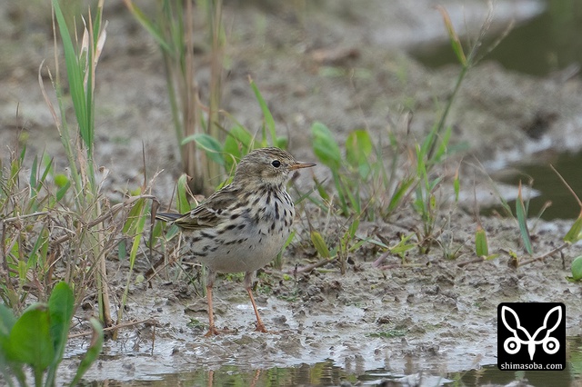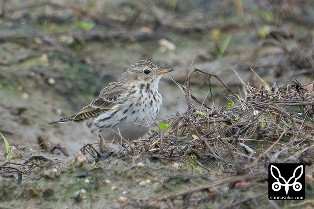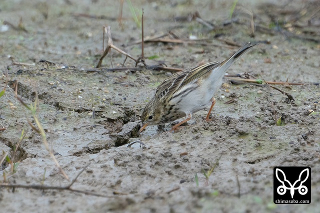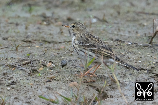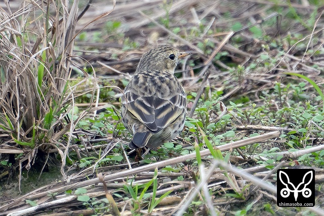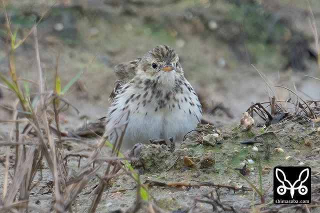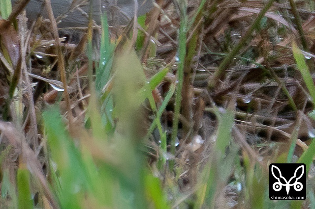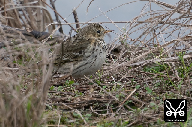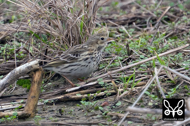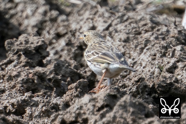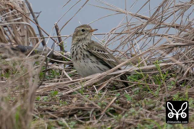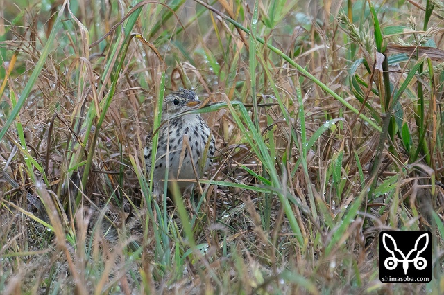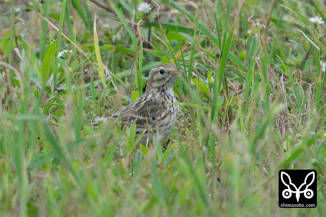 きれいに全身が撮れたと思ったら手前に草がかぶっていましたが、マキバタヒバリの特徴である長く直線的な後趾の爪は写っていました。識別に役立ちますがここを見られる状況ならほかでも識別できていると思われます。^^;