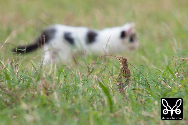 野良猫を警戒するマミジロタヒバリ。